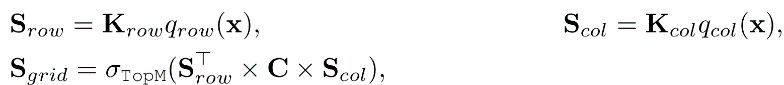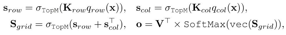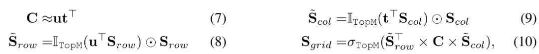,对应于上图的步骤3。总的来说,论文在行和列分数上进行近似的 top-m 操作,过滤掉非顶部元素,然后作者在Sgrid上使用具体的最终 top-m 操作,保持索引评分的精确性: