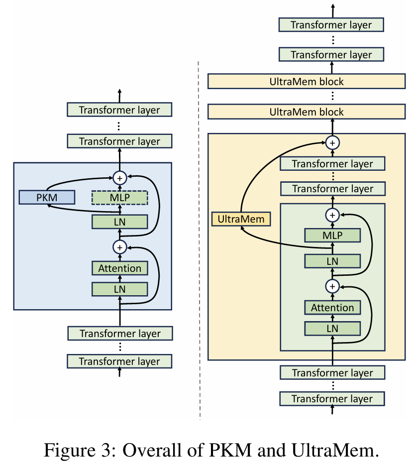 下图展示了基于预层归一化(Pre-LayerNorm)Transformer 架构的 PKM 和改进的 UltraMem 结构。PKM 替换 MLP 或与更深层中的 MLP 并行操作(Kim & Jung, 2020),然后用记忆层替换 MLP。