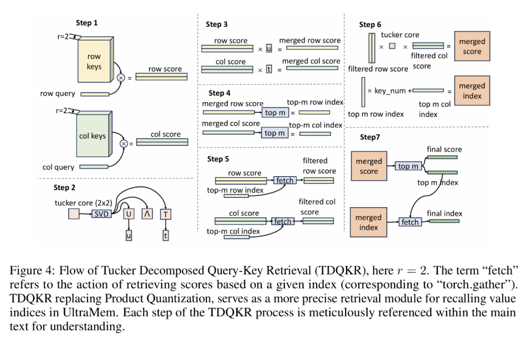 • 张量分解(Tensor Decomposition):张量分解技术将原本较大的张量分解为一系列小矩阵或张量。在深度学习研究中,此类方法通常用于在训练期间作为大张量的近似压缩,达到节省计算和参数的目的。Jegou团队在2010年提出了乘积量化(Product quantization)技术,该技术将一个向量分解为多个子向量,使人们能够使用更少的子向量重建原始向量,从而减少模型参数。在2024年Bershatsky团队使用了多个矩阵和一个核心张量,在微调阶段训练这些参数,并在训练结束时以塔克分解(Tucker Decomposition)的方式重建原始的张量,以降低训练成本。作者团队借用了这一方法来改进PKM的键值检索。