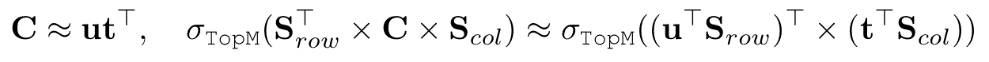 然而Sgrid 的计算方式在实际应用中效率不高,因为top-m操作无法像乘积量化那样通过等效的两阶段top-m技术来简化。因此,论文提出了一种近似的top-m算法来解决这个问题。关键是对Tucker核心进行秩为1的近似,这样整体的top-m就可以通过以下方式来近似: