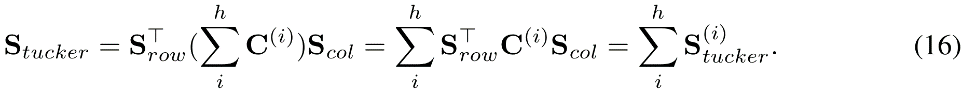 • 多核评分机制(Multi-core Scoring,MCS)。PKM在每个值的维度上共享一个单一的评分。实践证明,为单个值分配多个评分可以提高性能。因此,论文将Tucker核心 C 重写为一系列组件核心