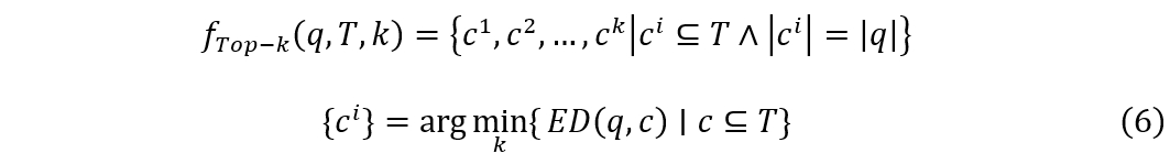 给定查询序列 q、目标序列 T、搜索数量 k 和相似性度量 ED(·,·)。top-k 查询函数 f(Top-k) 将返回 T 中与 q 最相似的 k 个子序列 ci。