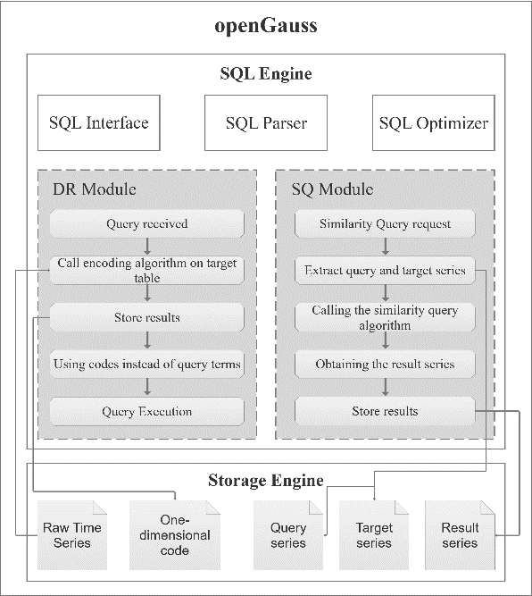 TSQ框架结构如图 1 所示。本文将 DR 和 SQ 模块集成到数据库内核中,作为 SQL 引擎的组成部分,使用户在数据查询时能够随时调用这些模块。具体来说,当用户发送各种查询请求时,SQL 引擎会根据查询类型动态选择并调用适当的模块。例如,如果用户提交一个相似性查询语句:SELECT SimilarityQuery('q','T'),系统会识别目标序列 T 中与查询序列 q 最匹配的序列。随后将完整的结果序列提取后存储在数据库中。