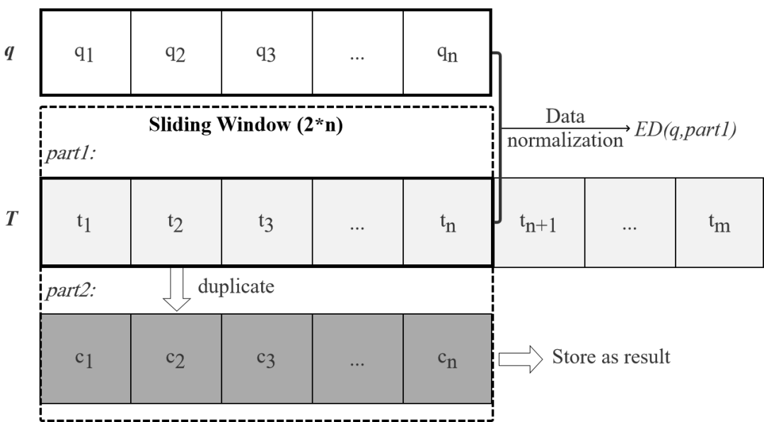 滑动窗口长度设置为查询序列q的两倍。窗口将等长于q的候选序列提取到part1,并将原始数据复制到part2。仅当累计距离小于bsf时,执行对part1中数据的Z标准化后计算与q的距离,并且可以直接将part2保留为临时查询结果。并且滑动窗口的使用对于新的候选序列的标准化计算也有帮助。