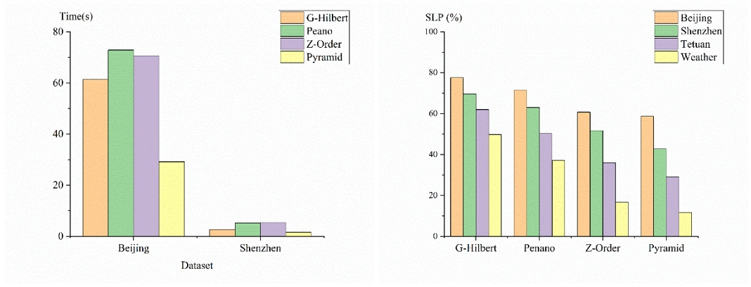 首先选择了两个较大的数据集“Shenzhen”和“Beijing”,以评估本文降维编码算法与基准算法的性能差异。并且使用数据空间局部性保持作为算法降维的质量评估指标,再次进行对比实验。两次实验结果如图3所示: