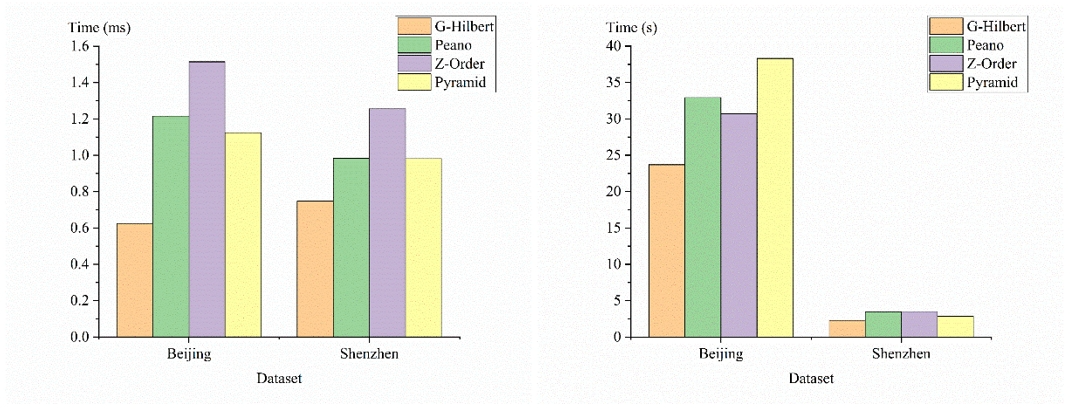 对比实验表明,G-Hilbert 在保持空间局部性方面表现更为优越。与其他基准算法相比,本文的方法表现出最优的空间局部性保留效果。本文在降维后的二元组(Timestamp,Code)上构建了B-树索引,并在“Beijing”和“Shenzhen”数据集上进行了实验。评估了四种方法在点查询和范围查询中的时间效率(图4)。