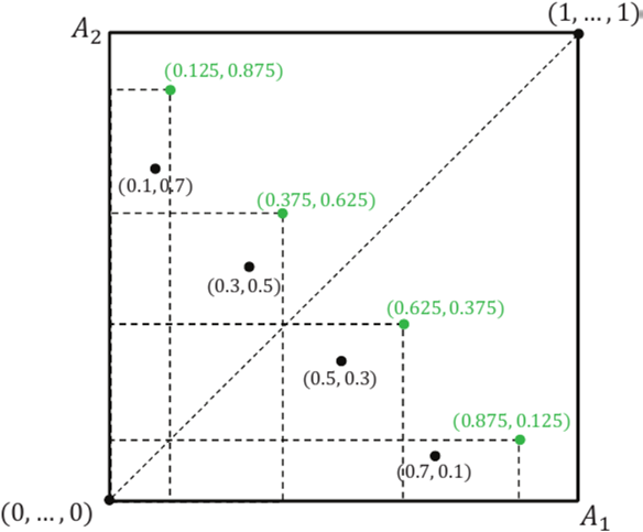 图2. 候选元组的图示,用于选择性检索,其中C={(0.1,0.7),(0.3,0.5),(0.5,0.3),(0.7,0.1)}和ε= 0.2。