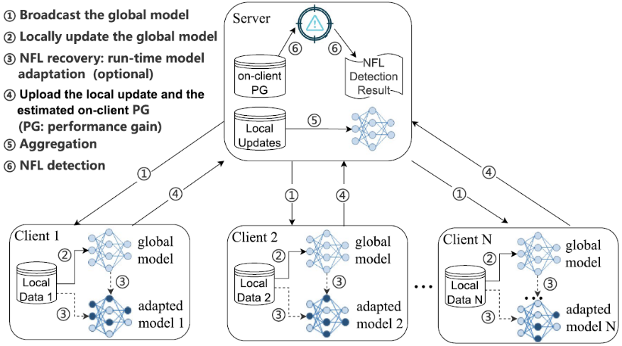 本文提出了一种在联邦学习算法运行时解决负联邦学习问题的系统框架FL-GUARD。该框架将负联邦学习视为一种可测量、可检测、可避免、并且可能发生在任意一次联邦学习过程中的状态。当负联邦学习状态出现时,系统可以采用我们所提出的自适应模型训练方案将负联邦学习状态修复为健康的联邦学习状态。图1展示了FL-GUARD总体框架图。