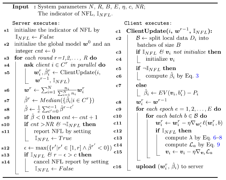 除了提供系统整体层面的设计,本文也考虑了客户端个体层面的行为,包括当客户端发现自身性能增益估值在超过NR轮学习过程中始终为负,而系统尚未报告负联邦学习状态,此时,客户端可以独立启动自适应模型训练用于修复本地学习状态;类似的,客户端也可以独立撤销自己所启动的修复策略。由于这些客户端个体行为不会影响系统整体层面的学习结果,因此FL-GUARD允许这些行为的存在。