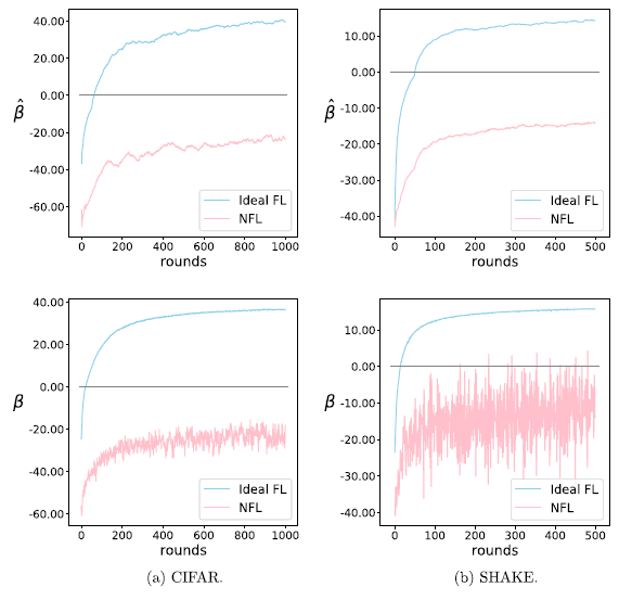 图3. 系统总体性能增益估值及其真实值在理想联邦学习状态和负联邦学习状态下的结果 (此实验采用传统联邦学习算法FedAvg以展示负联邦学习状态)