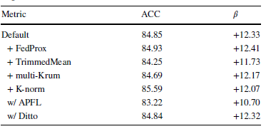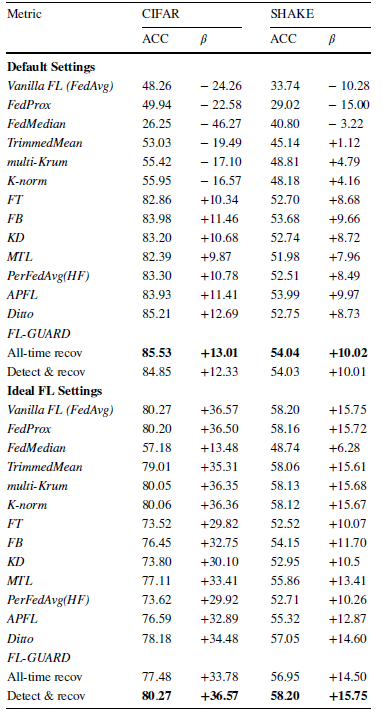 表8. FL-GUARD兼容不同负联邦学习解决方案所取得的性能效果