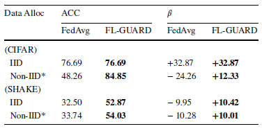 表4. 客户端数据分布对FL-GUARD的性能效果影响