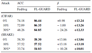 表6. 恶意客户端占比对FL-GUARD的性能效果影响