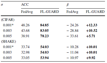 表7. 隐私保护策略引入的噪声大小对FL-GUARD的性能效果影响