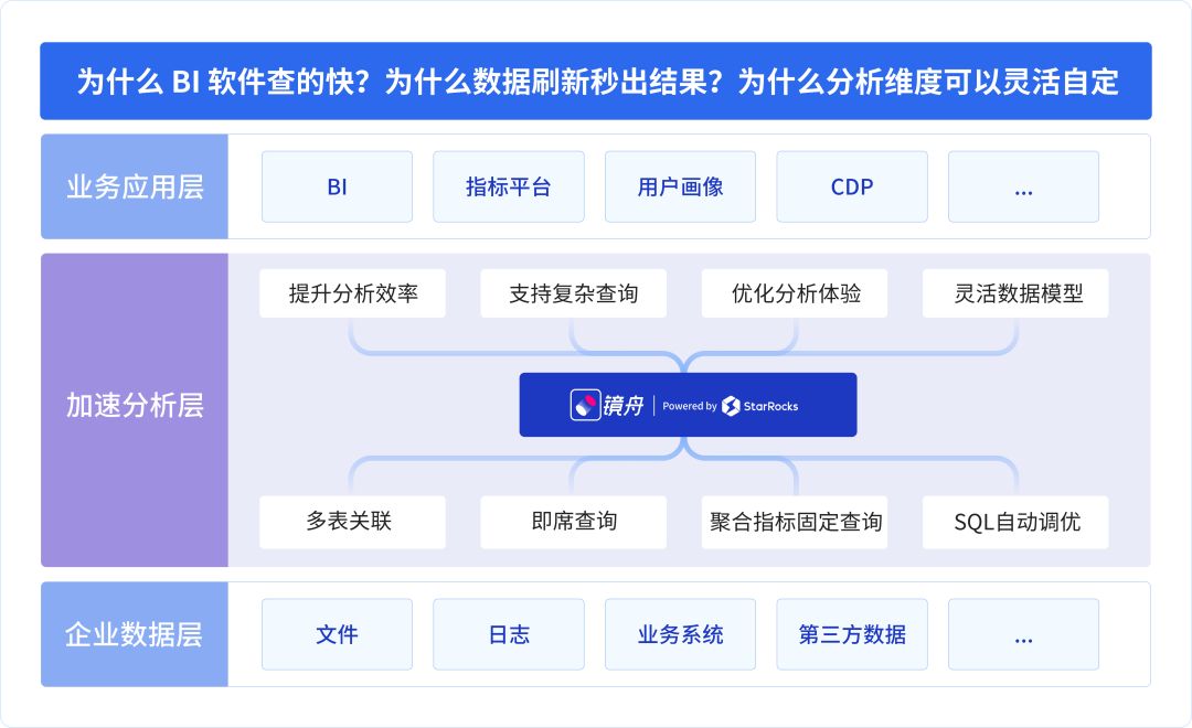 镜舟数据库作为底层数据引擎,在 OLAP 分析层帮助业务人员实时获取数据结果,实现高价值的数据决策。无论是金融的实时交易类业务、还是制造业的质量实时追溯场景,镜舟数据库均可满足亚秒级数据响应速度。