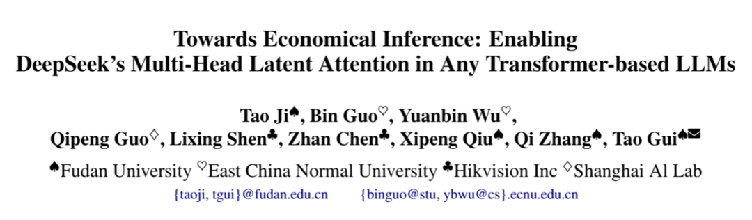 本周推荐的是arxiv 2025.2上的论文:Towards Economical Inference: Enabling DeepSeek's Multi-Head Latent Attention in Any Transformer-based LLMs,该文提出了一种高效微调方法,将标准的多头注意力机制转换为多头潜在注意力,以提高推理效率并降低内存占用。作者来自复旦大学,华东师范大学,海康威视有限公司和上海人工智能实验室。