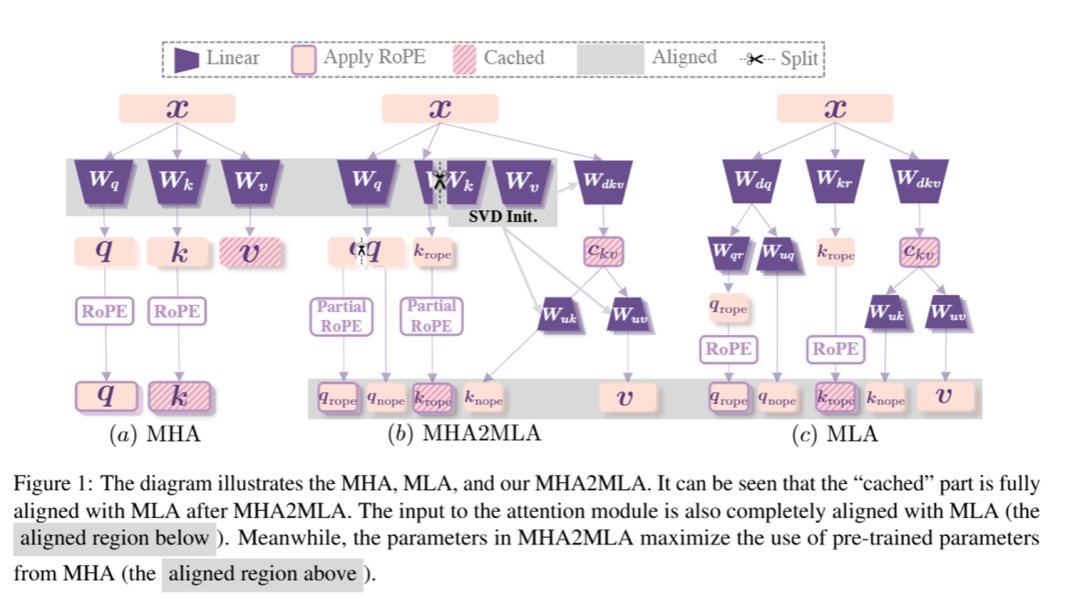 这引发的一个关键且未探索的问题是:最初为MHA精心训练的LLM能否适用于MLA进行推理?MHA和MLA之间固有的架构差异使得零样本转移不切实际,而从头开始预训练的高昂成本使这一转换在技术上具有挑战性且现有研究中未能得到充分探索。为解决这一问题,该文提出了首个数据高效的微调方法,以实现从MHA到MLA(MHA2MLA)的过渡,该方法包括两个关键组件:对于部分RoPE,作者从对注意力分数贡献较小的查询和键的维度中移除RoPE;对于低秩近似,作者引入基于键和值的预训练参数的联合SVD近似。这些精心设计的策略使得MHA2MLA能够仅使用很小一部分数据(3‰至6‰)恢复性能,大幅降低推理成本,同时与KV缓存量化等压缩技术无缝集成。例如,Llama2-7B的KV缓存大小减少了92.19%,而LongBench性能仅下降0.5%。