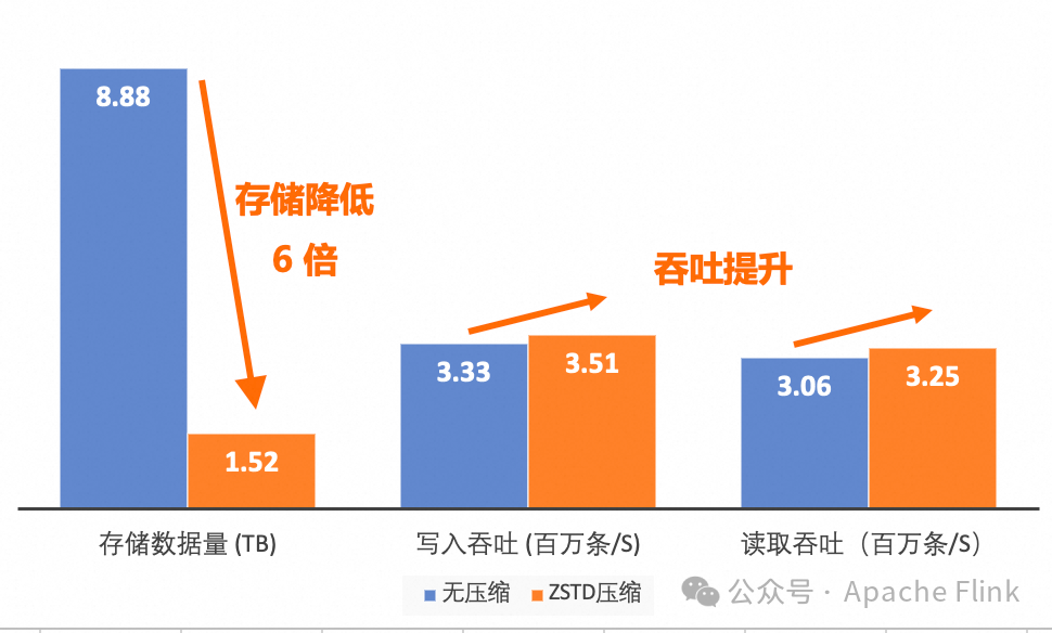 鉴于列压缩在通用场景均有显著的成本收益和性能提升,在 Fluss 0.6 版本中,日志表默认开启了 ZSTD 压缩,用户可以通过在表上设置 'table.log.arrow.compression.type'='NONE'