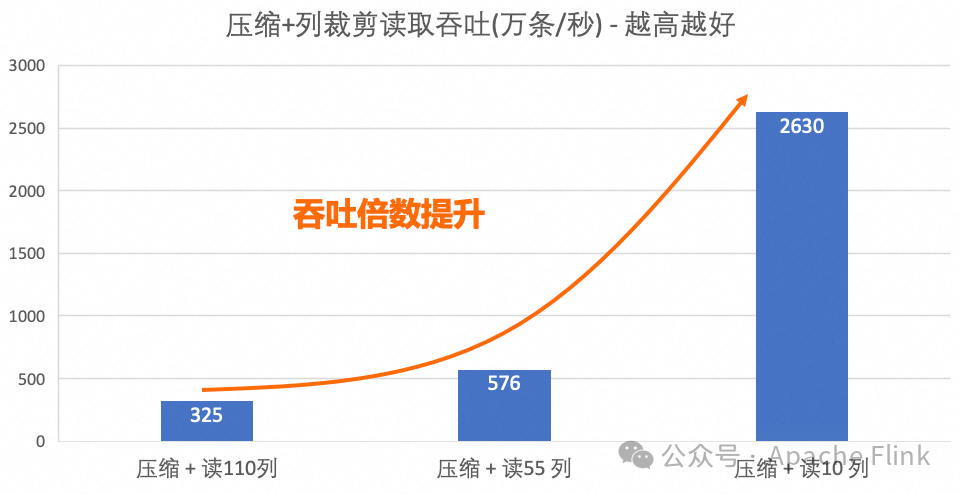 Fluss 默认采用 Apache Arrow 列存格式存储实时日志数据,并充分利用 Arrow 的流式列存特性,实现了高效的流式读取与列裁剪能力。Fluss 的列裁剪操作在服务端完成,并通过端到端的零拷贝(zero-copy)优化,无需将数据从磁盘加载到内存即可直接将所需的列数据发送至网络。这一设计不仅显著提升了性能,还大幅降低网络I/O成本,减少了资源开销。在 Fluss 之前的 基准测试 中,当裁剪掉 90% 的列时,Fluss 的读取吞吐量提升了 10 倍 ,充分展现了其在流式数据处理和传输方面的卓越表现。