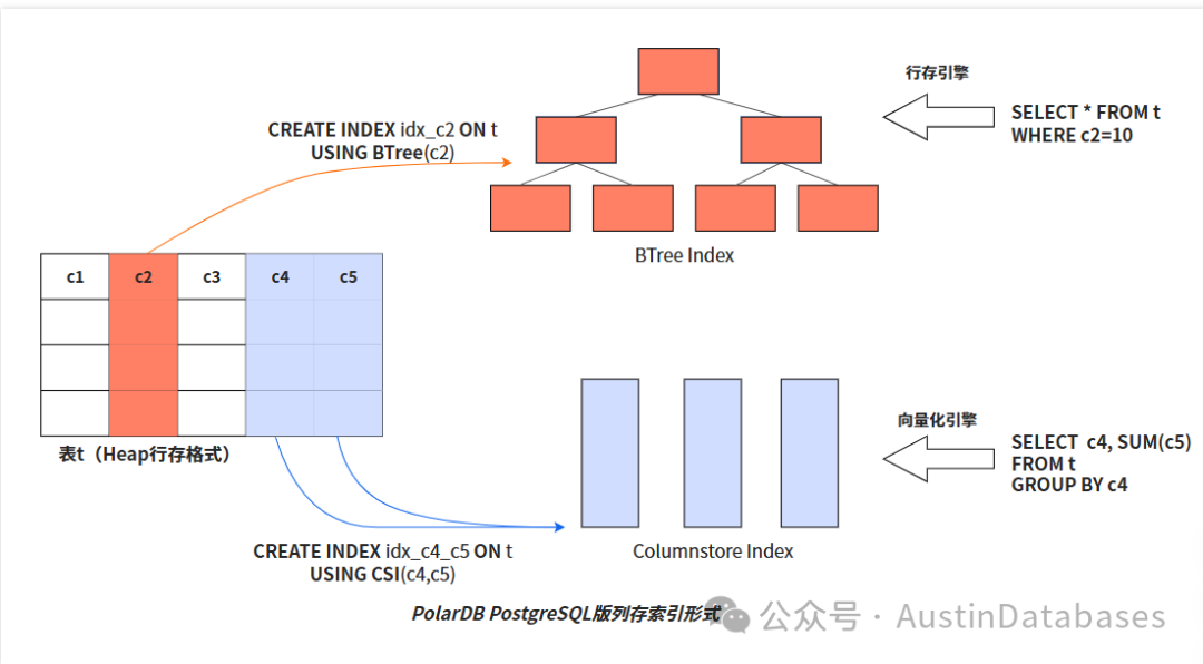 3 表中可同时存在列存索引(用于向量化引擎)和B-tree/GiST索引(用于行存引擎)。 优化器根据查询类型动态选择: 分析型查询(如SELECT sum(salary) FROM employees)优先使用列存索引 事务型查询(如UPDATE employees SET salary=...)使用行存索引