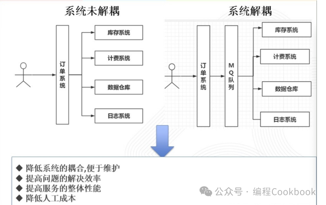 功能描述: 将消息的发送者(生产者)和接收者(消费者)解耦,双方不需要直接通信,只需通过消息队列交互,避免调用接口失败导致整个过程失败;