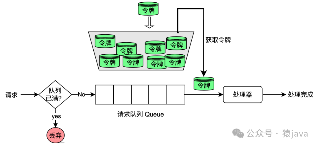 令牌桶算法的核心思路:系统按照固定速度往桶里加入令牌,如果桶满则停止添加。当有请求到来时,会尝试从桶里拿走一个令牌,取到令牌才能继续进行请求处理,没有令牌就拒绝服务。示意图如下: