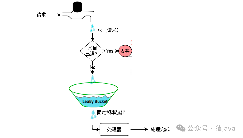 漏桶算法(Leaky Bucket Algorithm)的核心思路是:水(请求)进入固定容量的漏桶,漏桶的水以固定的速度流出,当水流入漏桶的速度过大导致漏桶满而直接溢出,然后拒绝请求。示意图如下: