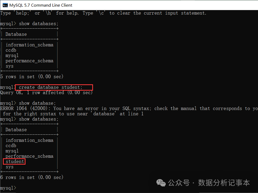 从上图中可以看到MySQL中并不存在student这个数据库。