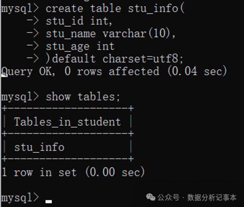 创建完以后通过show tables; 可以查看这个表是否已存在。