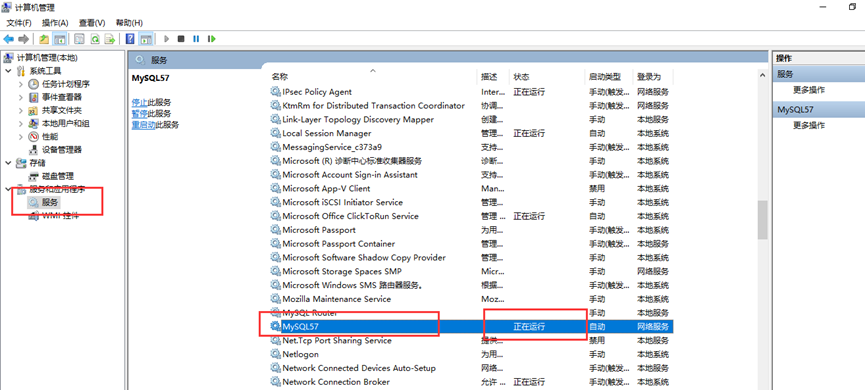 右键点击“此电脑”-“管理”-“服务和应用程序”-“服务”,在此界面找到Mysql服务,如果状态显示“正在运行”,则说明已安装成功。