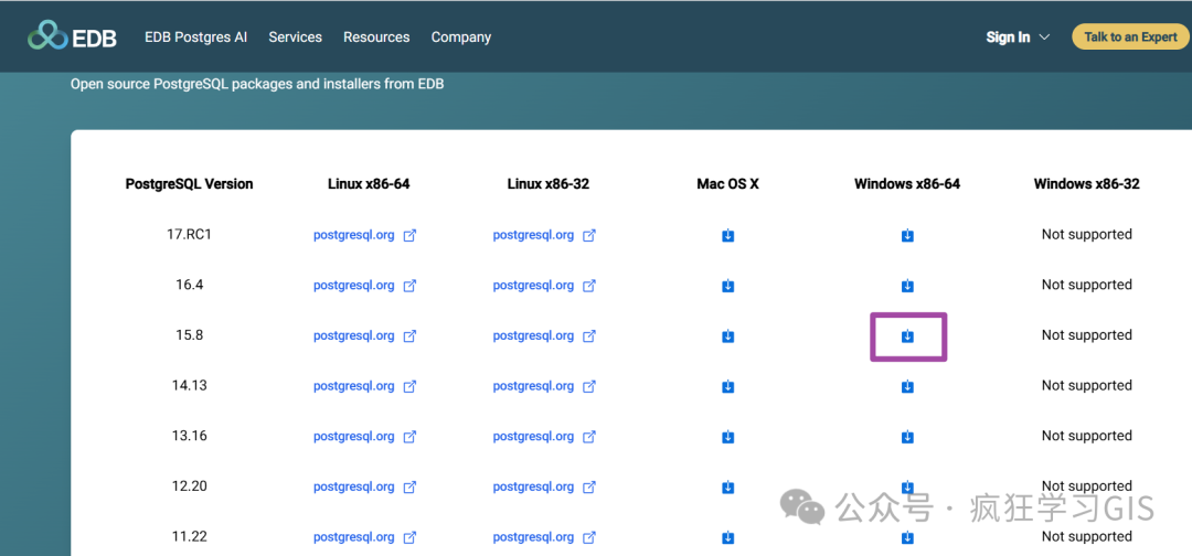首先,我们进入PostgreSQL的官方下载网站(https://www.enterprisedb.com/downloads/postgres-postgresql-downloads)中,找到所需版本与操作系统的PostgreSQL,如下图所示。