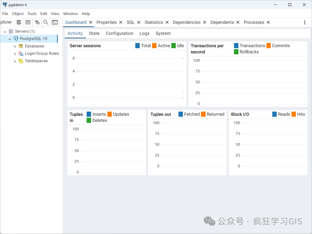 如果出现如下图所示的界面,表明我们本机的PostgreSQL已经下载、安装完毕,并且已经成功运行了PostgreSQL服务,且可以通过pgAdmin 4工具访问本地的PostgreSQL数据库了——在Windows下,PostgreSQL安装完毕后默认自动启动。
