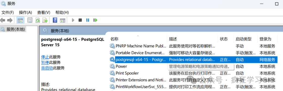 此外,如果电脑重启后,默认情况下PostgreSQL数据库服务应该也是默认自动启动的;如果没有启动,可以在服务列表中手动将postgresql-x