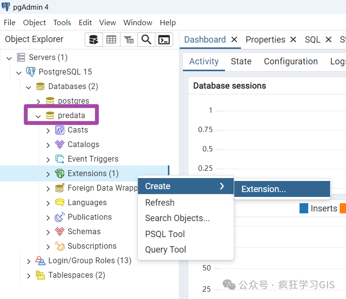 随后,在刚刚创建的数据库中,选择“Extensions”,并右键选择“Create”→“Extension”,如下图所示。
