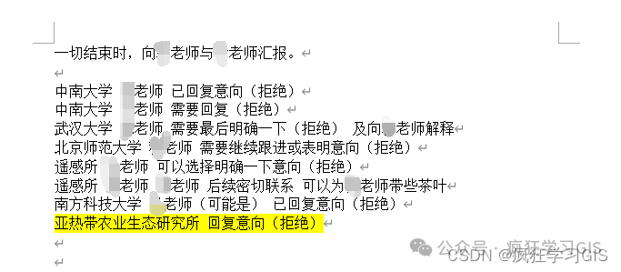 其次,对于像我这样的“海王”,也就是预计会报名很多所院校的同学而言,强烈建议大家用一个文档或表格文件记录好每一所院校你所联系的导师(如果有的话),这样子方便你在后期根据自己的实际选择,尽早对确定不去的院校的老师表明态度,争取不要因为自己是海王而耽误老师的正常招生工作。下图是我当初记录的内容,其实很简单,找一个Word文档写一下学校名、老师名和你的选择就好;只要自己后期确定不去这所院校了,就第一时间和该学校当初联系过的老师说明情况,切不可耽误老师们的招生进度。