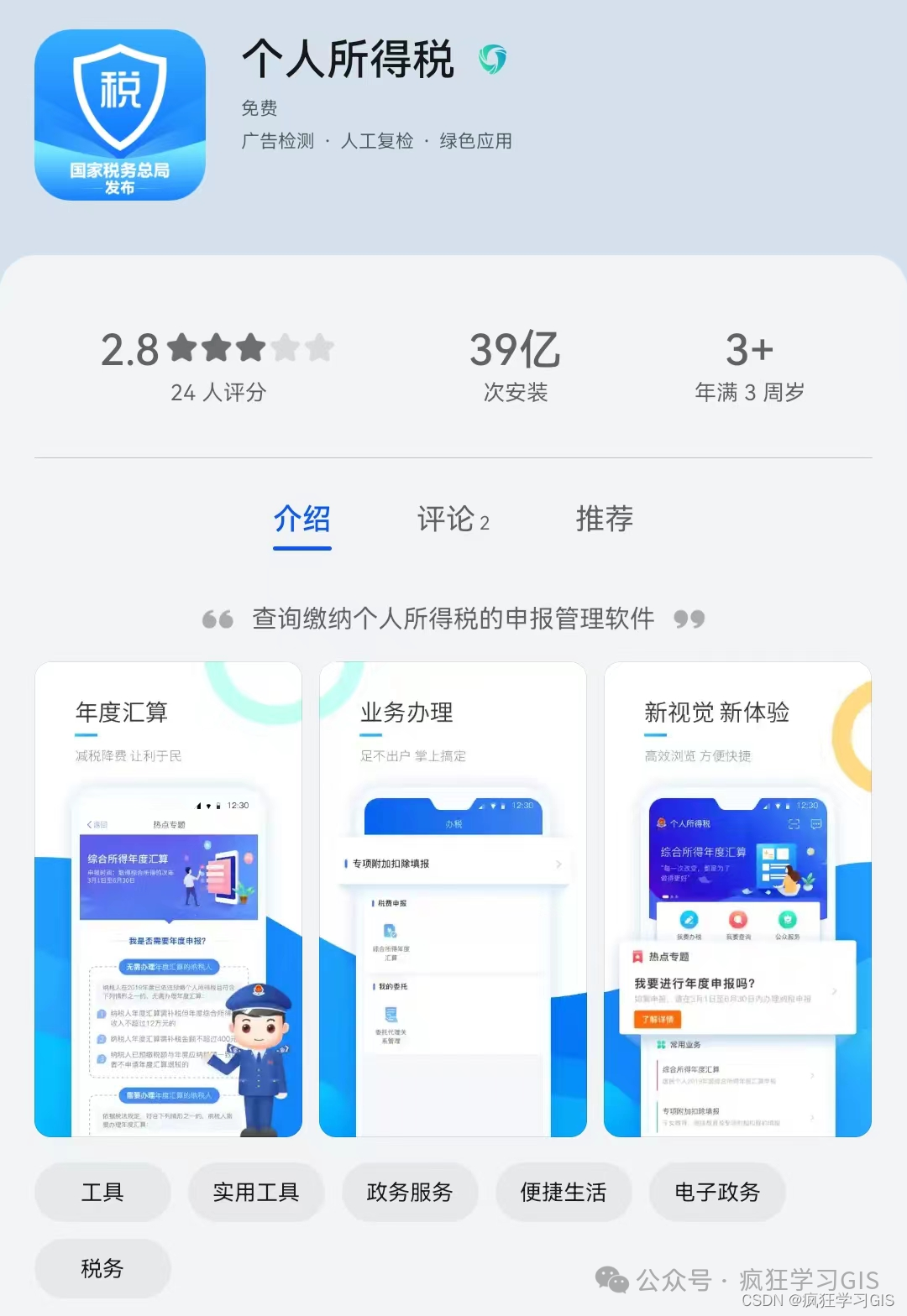 首先,到手机应用市场中,搜索“个人所得税”软件并下载、安装;这一软件具体如下图所示,大家一定要确认不要下载错了。