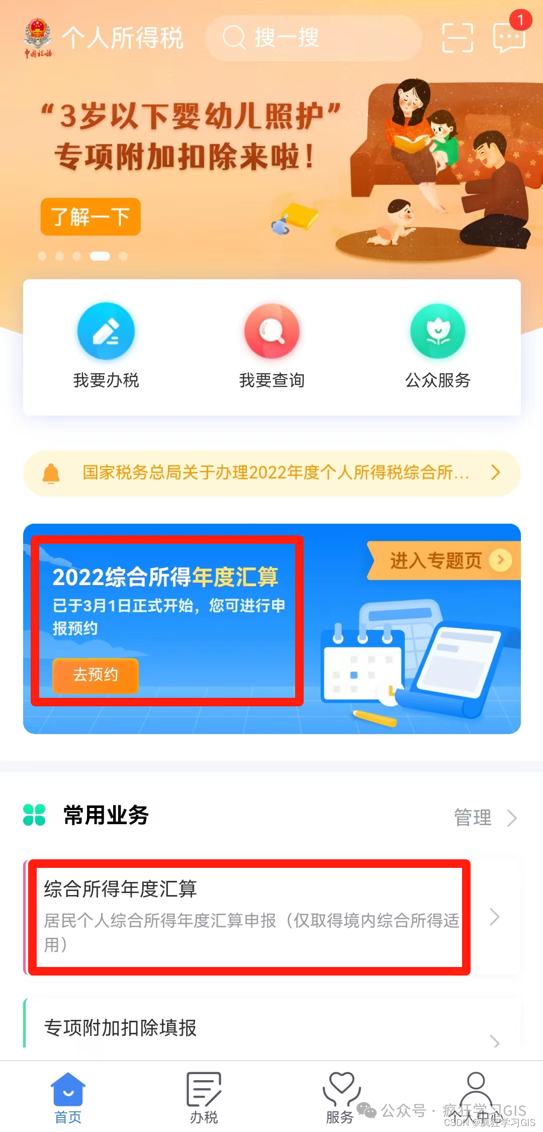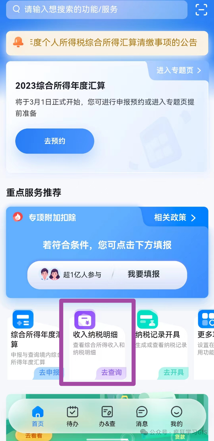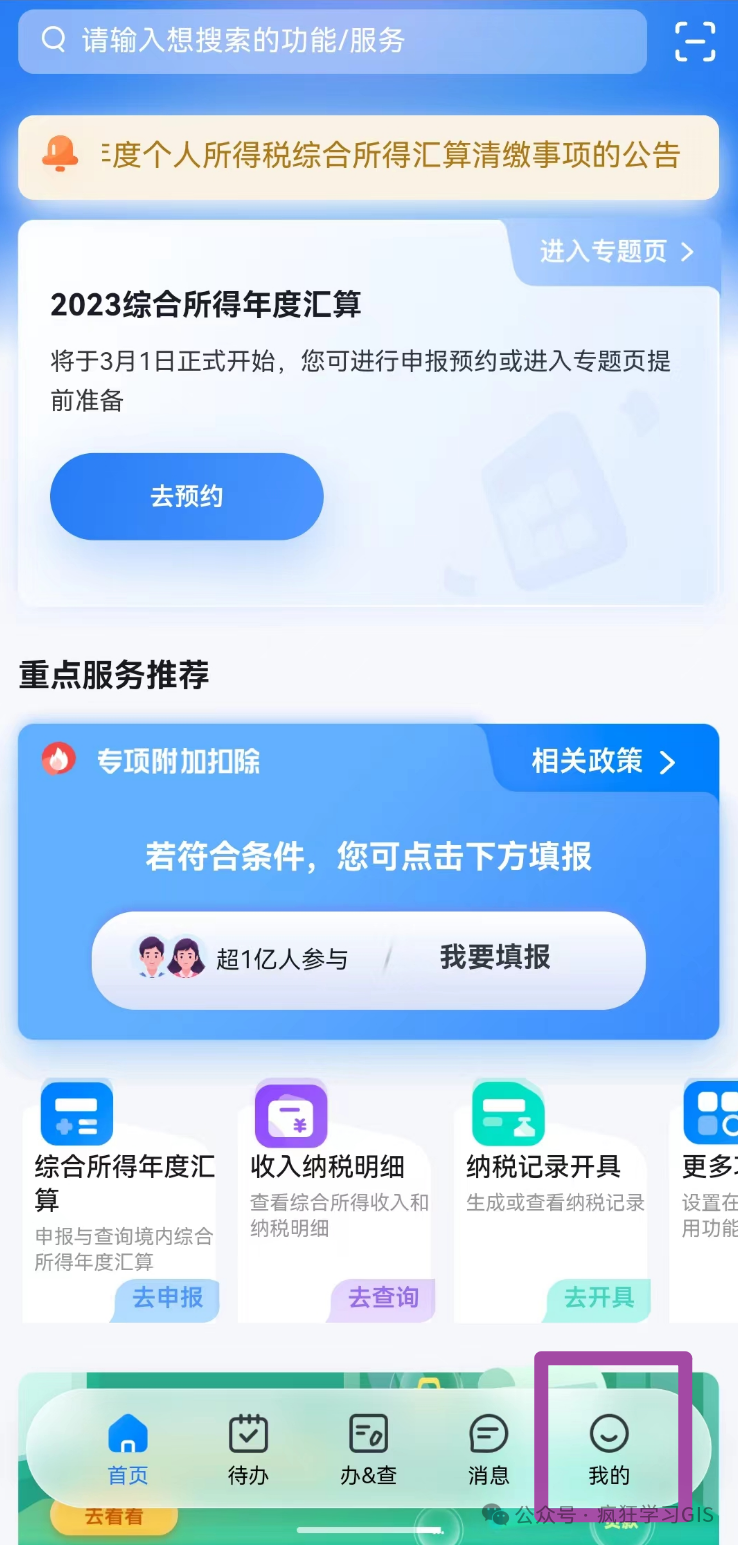 接下来,我们介绍办理当日的流程。等到大家预约的日子,或者是到了不需要预约就能办理的03月21日后,大家打开软件并登录后,依然选择“综合所得年度汇算”即可。