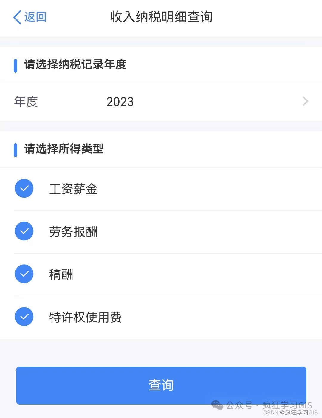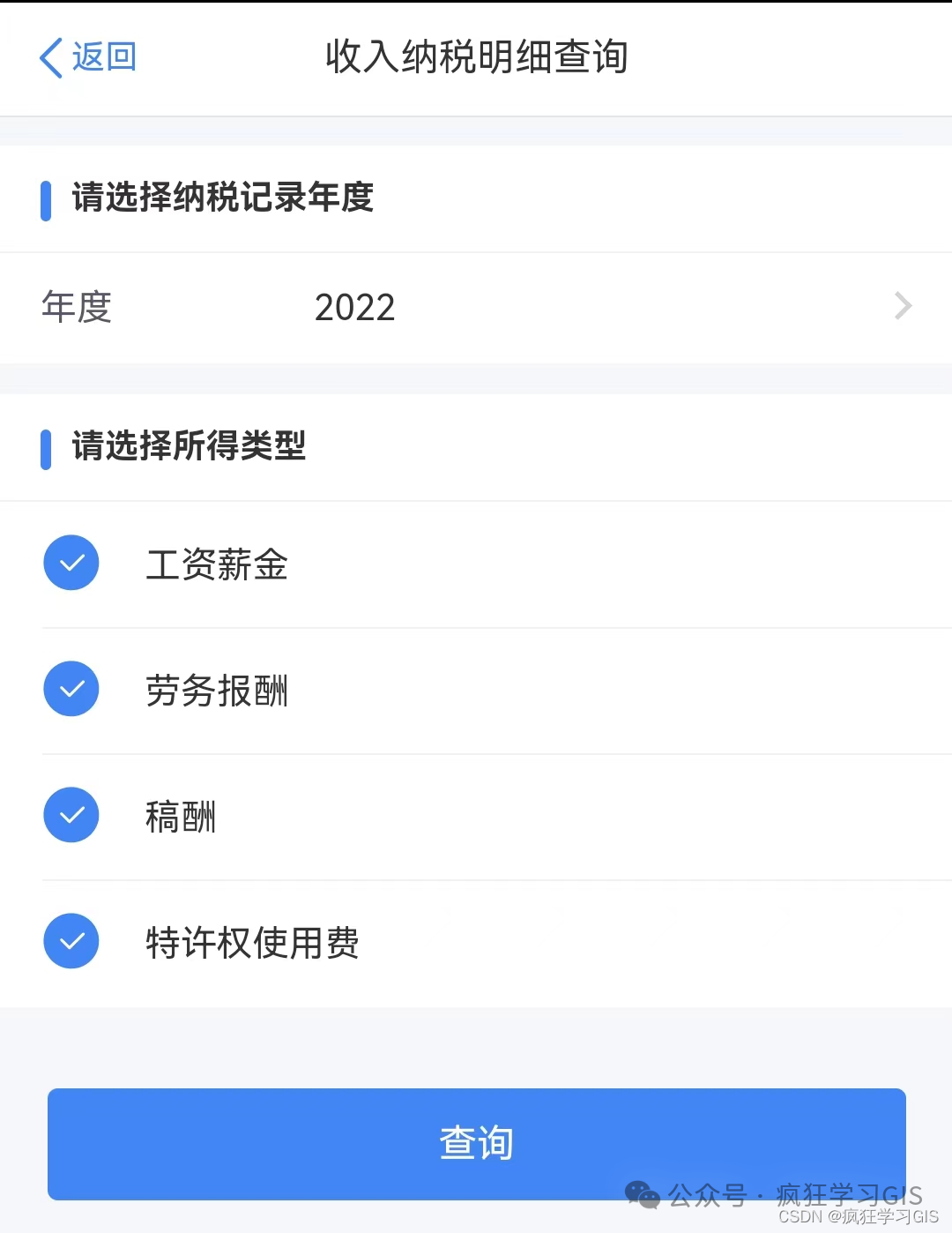 随后,选择我们希望查询的年份,并在下方的勾选项中选中全部内容。在这里,我们可以将所有能选择的年份都查询一遍,看看每一年的纳税情况(下图是当初APP改版之前截取的,但是图片变化不大,不影响操作)。
