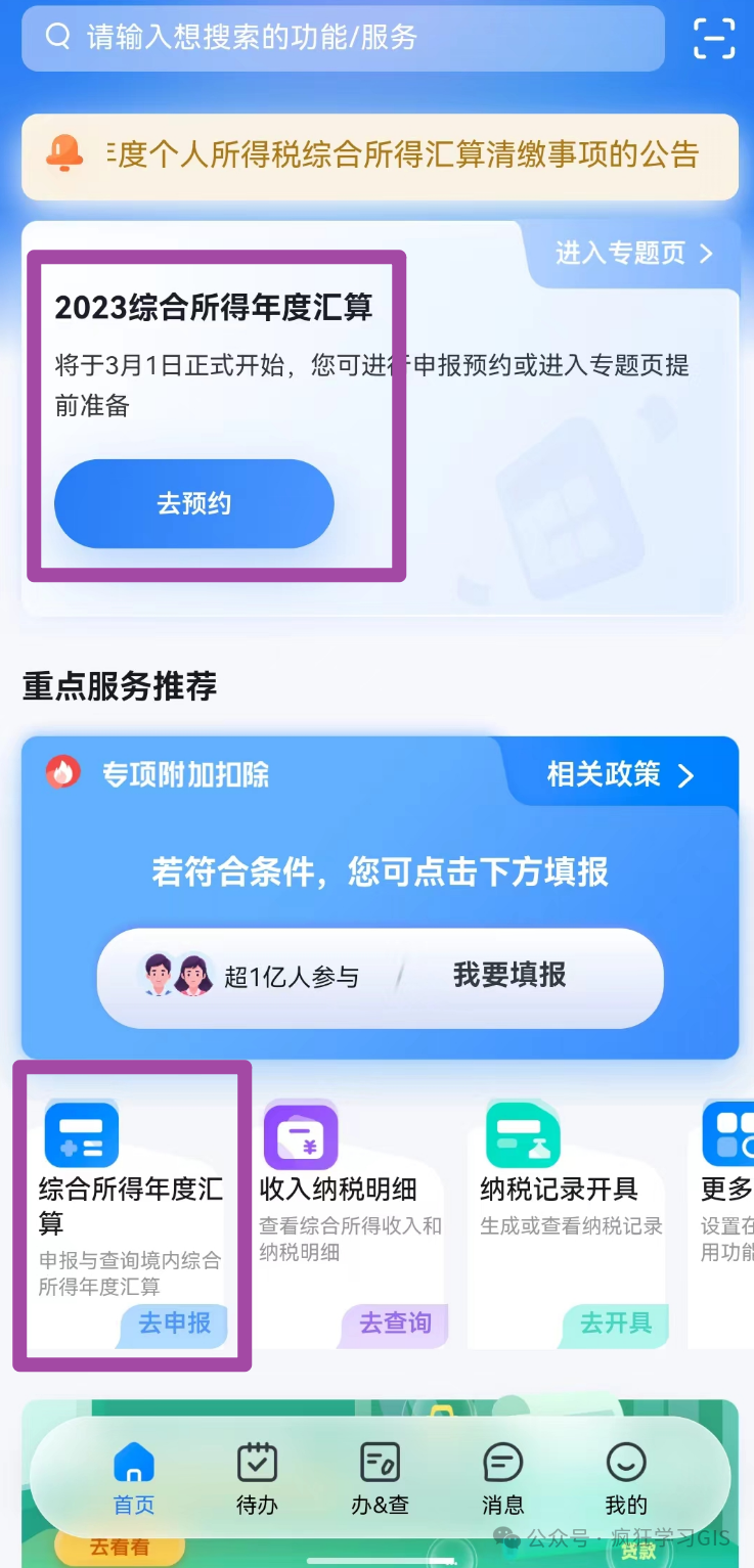 接下来,我们就可以开始退税申请了。在软件的“主页”中,选择如下图所示的任意两个位置,即可进入“综合所得年度汇算”页面。