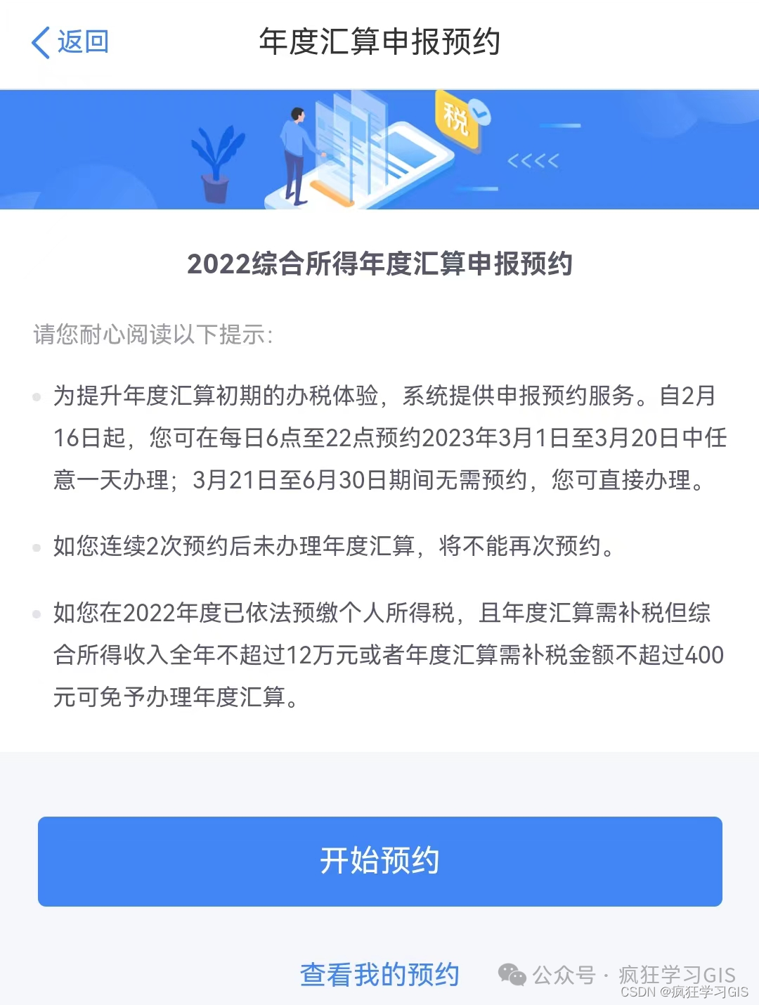 随后,若是大家在每一年的03月01日至03月21日办理退税,则需要提前预约;如果是03月21日后办理则不需要预约。这里如果大家不想预约,就可以等到03月21日后再办理;此外就可以预约一下。