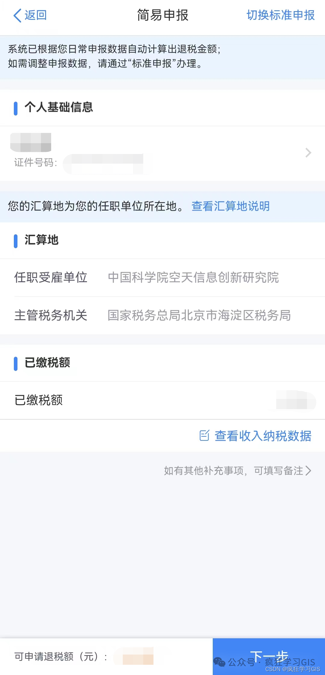 对于研究生而言,我们的收入多数都由院校为我们申报过了,所以退税时将自动进入“简易申报”的流程;其中,各项信息都将由系统自动为我们填写。