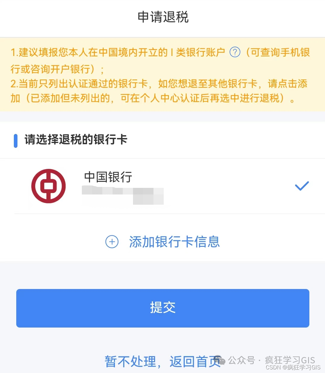 添加银行卡并确认无误后,即可完成退税的申请。