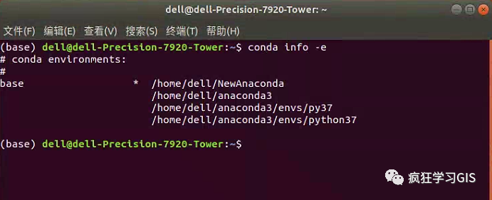 我们可以通过在终端中输入如下的代码,查看当前Anaconda环境中的环境。