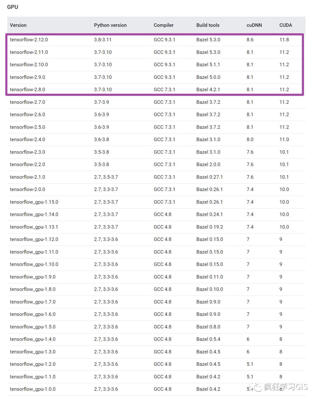 库版本与对应的CUDA、cuDNN版本匹配表格,确定我们需要的版本。例如,如下图前3