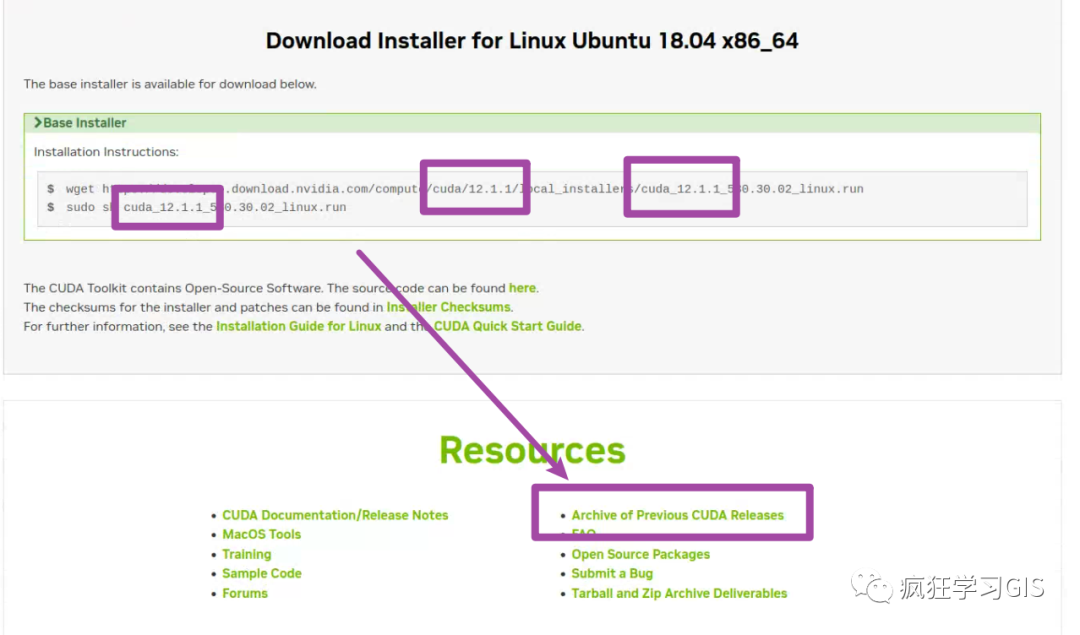 个紫色框所示,网站中给出的CUDA版本是12.1.1