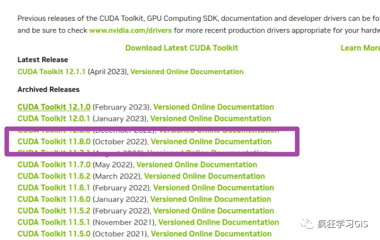 的,因此就需要通过下图中“Archive of Previous CUDA Releases”选项,找到老版本的CUDA。
