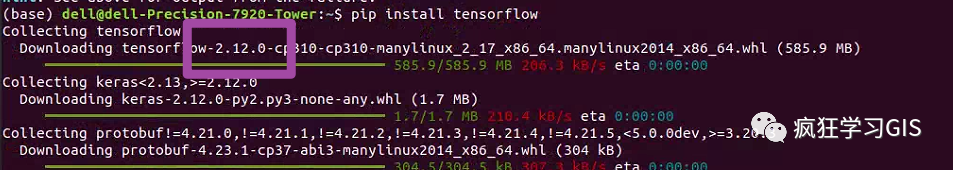 运行上述代码,我们将自动开始安装当前环境(也就是Python版本)支持的最新版本的tensorflow