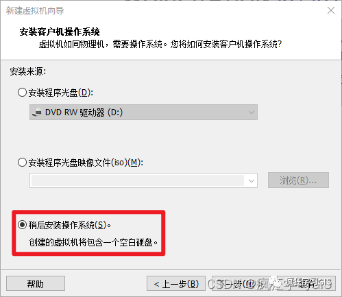 随后,在如下所示的界面中,如果我们此时已经完成了Linux Ubuntu操作系统镜像文件的下载,那么可以选中第二项“安装程序光盘映像文件(iso)”选项,并选择我们下载好的Linux Ubuntu操作系统的镜像文件;如果此时还没有下载好镜像文件,那么选择下图中红色框内的选项即可。