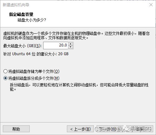 接下来,我们需要配置虚拟机所占用的磁盘大小。这里我们选择默认即可;后续使用虚拟机的过程中如果该项不合适,还可以再修改。