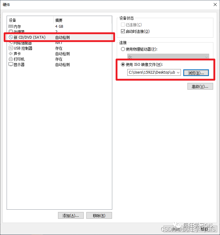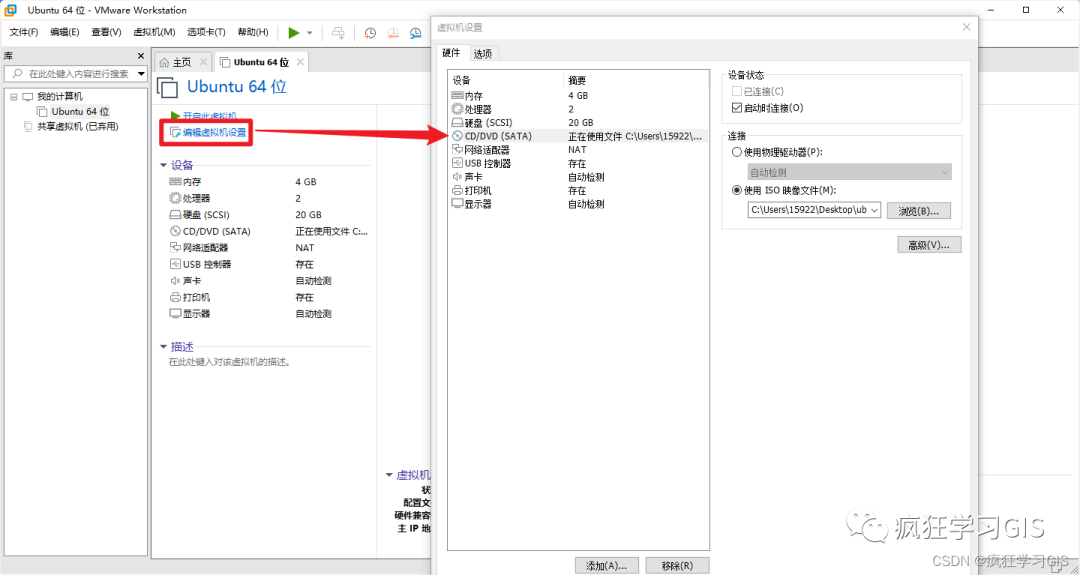 首先,如果Linux Ubuntu操作系统镜像文件是刚刚下载好的,我们需要在“编辑虚拟机设置”选项中,找到如下所示的界面,并在“使用ISO映像文件”处选择我们下载好的Linux Ubuntu操作系统镜像文件。